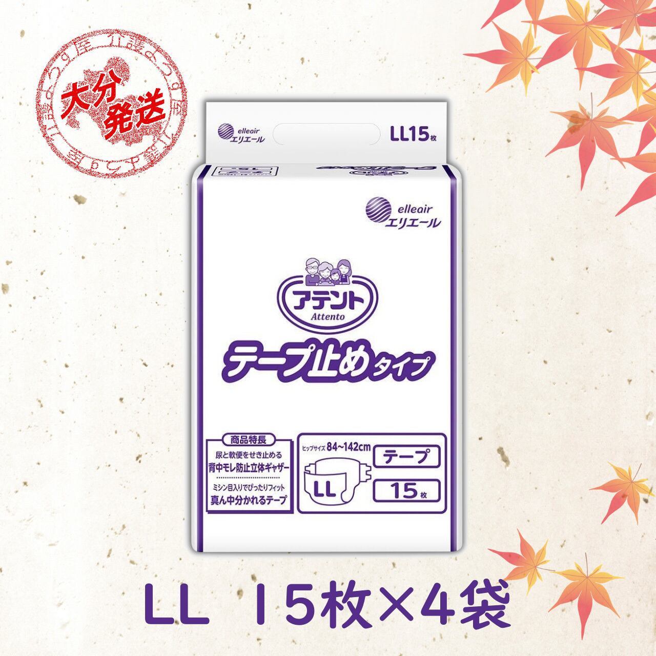 【取寄品】アテント テープ止めタイプ LL オムツ シート 15枚入×4袋 大王製紙 介護 業務用【ケース販売】は、介護や日常生活での使用に最適な高品質なオムツです。体型に合わせてぴったり止められる「真ん中分かれるテープ」を採用しており、装着の際の安心感を提供します。さらに、「センターライン(中心線)」により、おむつの中心と体の中心をしっかり合わせることができ、正しい装着が可能です。