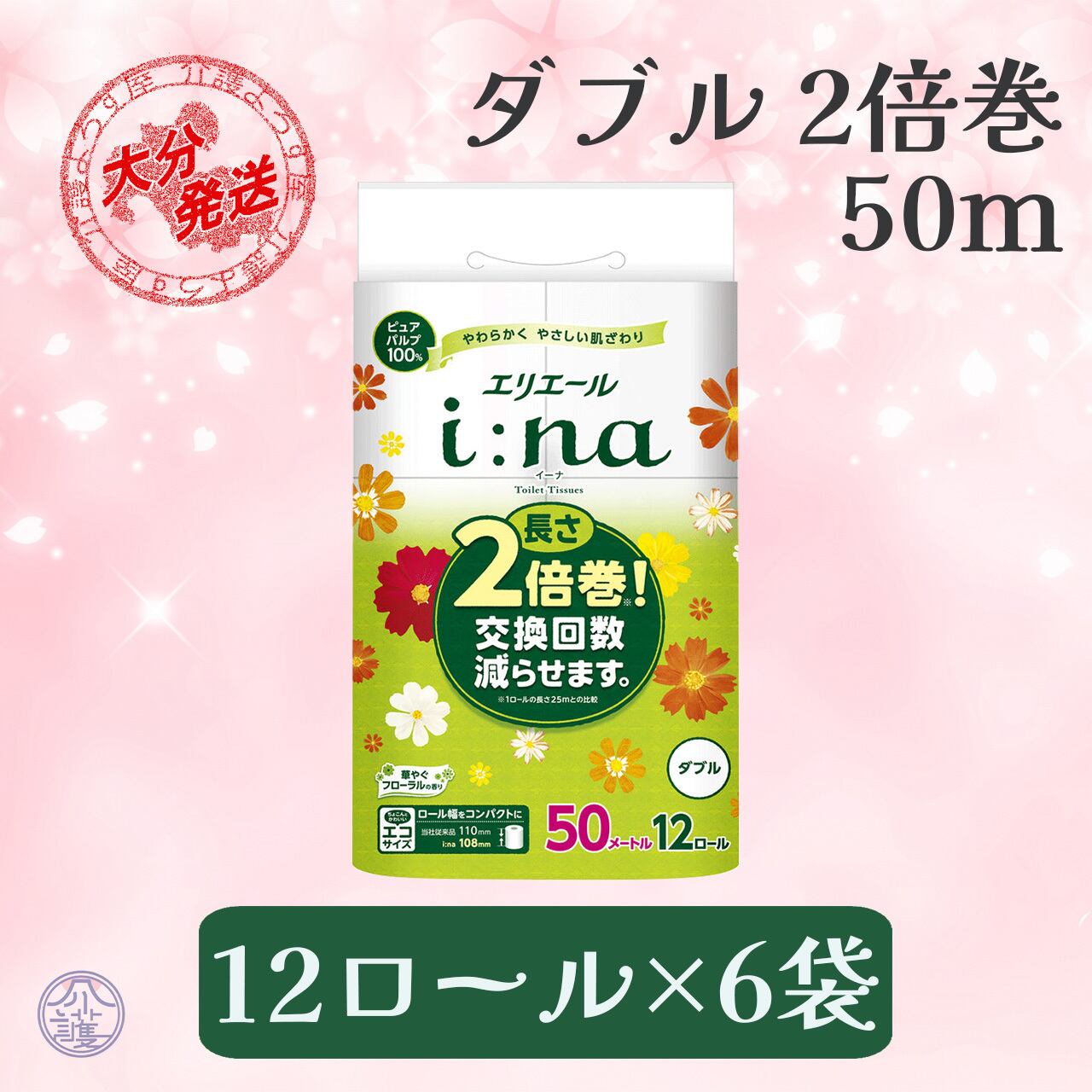 エリエール イーナ トイレットティッシュー 2倍巻き 50m ダブルは、スッキリとした収納が可能な高品質なトイレットティッシュです。サイズがコンパクトでありながら、2倍巻きにより交換回数を少なく抑えることができます。優れた肌ざわりで、お子様から大人まで安心してご利用いただけます。家庭用だけでなく業務用としても幅広くご活用いただける商品です。ぜひ使いやすさを実感してみてください。